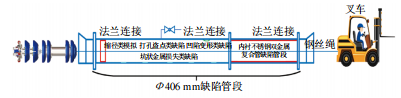 為驗證專(zhuān)項檢測器的各項性能指標是否滿(mǎn)足設計要求,開(kāi)展了專(zhuān)項檢測器在缺陷管道內的牽引測試。缺陷管道由多根管徑為406 mm的管道組成,一部分為常規壁厚的普通鋼制管道,一部分為包含內襯不銹鋼的雙金屬復合管道組成。每種管道上均包含縮徑、打孔盜點(diǎn)、凹陷變形和坑狀金屬損失等人工缺陷,另外雙金屬復合管內還存在部分內襯層與外基管剝離塌陷、褶皺變形類(lèi)的人工缺陷,如圖 7所示。