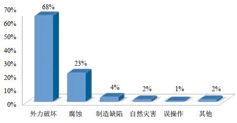 根據國內管道失效數據統計(圖 2),失效原因依次為外力損壞、腐蝕、制造缺陷、自然災害、誤操作和其他原因。結合中俄東線(xiàn)管道的實(shí)際情況,該特定場(chǎng)所高后果區風(fēng)險評價(jià)主要考慮第三方損壞、外部腐蝕、環(huán)焊縫失效三個(gè)因素。