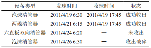 該管道進(jìn)行清管作業(yè)時(shí)共發(fā)送4個(gè)清管器,其中第一、第二個(gè)清管器正常收出,第三個(gè)清管器未清出,第四個(gè)清管器收出后破損,詳見(jiàn)表 1。