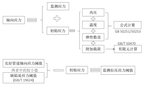為進(jìn)一步確保管道運行安全,投產(chǎn)前在斜坡中上部彎頭位置及坡腳處分別安裝X9及X8應力應變監測截面,管道軸向拉壓應力及監測拉壓應力閾值的計算方式如圖 2所示。