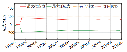 管道于2019年4月正式投產(chǎn)運營(yíng),運營(yíng)初期監測數據無(wú)明顯變化。當年6月,由于強降雨導致X9截面上方漿砌石擋墻垮塌,直接壓覆管道上方,X9截面監測值迅速增高,附加壓應力值達到黃色預警級別(﹣173 MPa,為容許值的66%)。通過(guò)立即對垮塌擋墻進(jìn)行修復,監測值逐步降至藍色預警級別并長(cháng)時(shí)間處于穩定狀態(tài)。2021年6月23日,受連續性強降雨的影響,X9截面監測值出現大幅增高,附加壓應力值再次達到黃色預警級別(﹣180 MPa,為容許值的68.9%)且處于持續增高狀態(tài)(圖 3)。X8截面監測數據長(cháng)期較為穩定,不做分析。