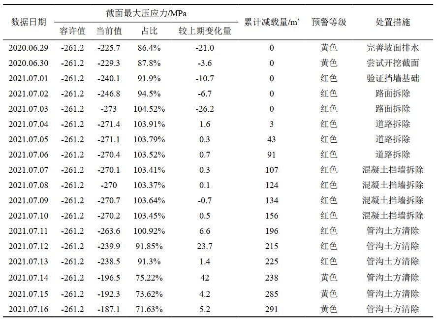 從表 1處置過(guò)程中的壓應力變化情況分析可知,6月29日至7月3日均為強降雨過(guò)程,X9截面壓應力明顯增高。伴行路路面及擋墻拆除過(guò)程中(7月2日至7月10日)X9截面壓應力除了7月3日降雨導致增高外無(wú)明顯變化;擋墻下方管道開(kāi)挖過(guò)程中(7月11日至16日)X9截面壓應力顯著(zhù)降低,取得較好的應力釋放效果(圖 5)。