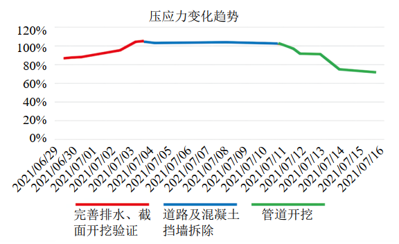 由于該區域降雨量持續較大,排水疏通后X9截面附加壓應力仍處于持續增高態(tài)勢,于6月28日增至﹣205.1 MPa,為壓力容許值的78.6%。結合當時(shí)氣象情況,認為應力值還有繼續增高的可能,立即啟動(dòng)應急響應進(jìn)行處置,以保障管道安全運行。