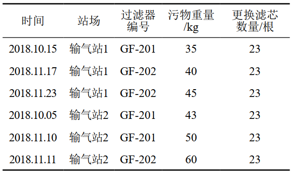 (1)過(guò)濾分離器濾芯更換情況。2018年5—11月兩個(gè)輸氣站過(guò)濾分離器濾芯更換記錄顯示, 5—9月沒(méi)有進(jìn)行更換,而10—11月每站更換3次(表 2)。