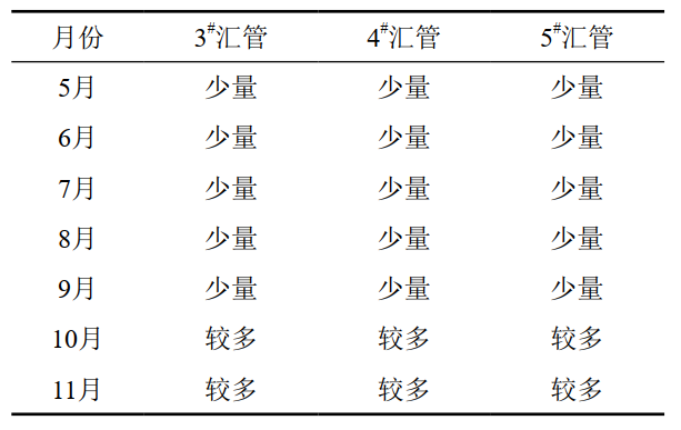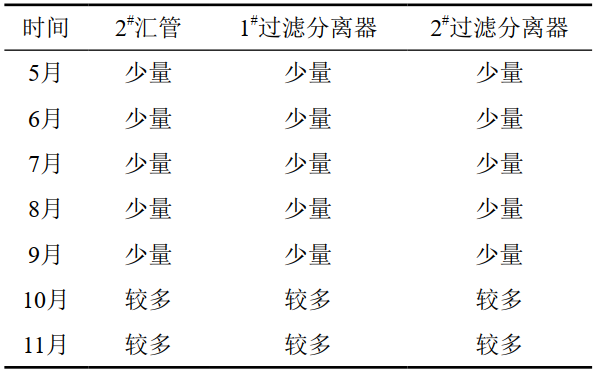 (2)過(guò)濾分離器及其上游匯管排污情況。5—9月污物較少,10—11月污物較多(表 3)。