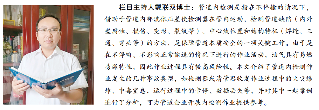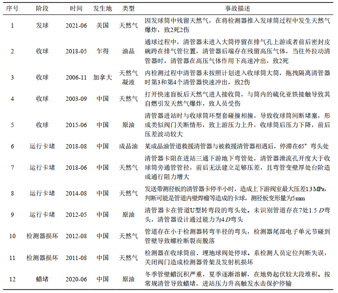 管道內檢測實(shí)施前,應制定適合的內檢測工作流程,包括內檢測技術(shù)與設備選型、檢測器性能驗證、踏線(xiàn)設標、管道清管/測徑、運行檢測器、數據分析和開(kāi)挖驗證,其中清管和內檢測階段風(fēng)險最大。影響檢測器正常運行的因素較多,包括管道收發(fā)球裝置尺寸和結構、管道管徑、三通、閥門(mén)、彎頭和管道壓力、流量以及現場(chǎng)操作等。近年國內外開(kāi)展內檢測(含清管)作業(yè)出現了諸如收發(fā)球過(guò)程中的火災、殘留高壓氣體引起的設備沖撞、運行過(guò)程中的卡停等事故事件(表 1),造成人員傷亡和設備損壞。對此需要引起重視,作業(yè)時(shí)應全面識別項目實(shí)施過(guò)程中存在的風(fēng)險因素,采取消減和控制措施,擬定異常情況的應急處置預案,確保檢測工作順利實(shí)施。