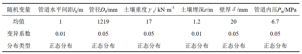 表 1 并行管道失效概率模型相關(guān)隨機變量統計分布[4-6]