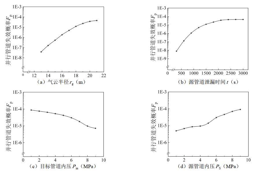 在管道運行階段,泄漏氣云半徑及管道內壓為并行管道失效概率主要影響因素。如圖 2(a)所示,氣云半徑與并行管道失效概率呈正相關(guān)關(guān)系。而氣云半徑大小主要取決于源管道泄漏時(shí)間,為探究該參數與并行管道失效概率之間的關(guān)系,基于文獻[2]的管道燃氣泄漏擴散模型,獲得源管道泄漏時(shí)間與并行管道失效概率關(guān)系曲線(xiàn)。如圖 2(b)所示,并行管道失效概率隨著(zhù)源管道泄漏時(shí)間的增加而逐漸增大。在源管道泄漏時(shí)間較短時(shí),泄漏氣云半徑相對較小,因此目標管道失效概率及并行管道失效概率均較小。而在源管道發(fā)生泄漏約2200 s后,由于其產(chǎn)生的爆炸載荷超出管道可承受的臨界值,導致目標管道必然發(fā)生失效,目標管道失效概率值趨近于1,此時(shí),并行管道失效概率主要取決于源管道失效概率。由圖 2(c)和(d)可知,增高目標管道內壓促使管道抵抗外部載荷的能力增強,從而有利于使并行管道失效概率下降,而增大源管道內壓,使源管道失效泄漏時(shí)燃氣的泄放速率上升,增加了源管道燃氣泄漏量,目標管道失效概率增大,進(jìn)而使并行管道失效概率上升。