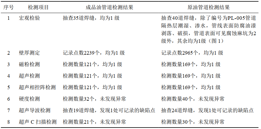 (1)成品油管道和原油管道檢測結果(表 1)。