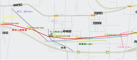 管道高電壓來(lái)自閥室周邊及管線(xiàn)的雜散電流干擾。陜京二線(xiàn)25#閥室及管線(xiàn)處在高壓交流輸電網(wǎng)中,閥室周邊有4條高壓線(xiàn),分別為西正二線(xiàn)220 kv高壓交流輸電線(xiàn)路、西鹿線(xiàn)220 kv高壓交流輸電線(xiàn)路、鹿冀線(xiàn)110 kv高壓交流輸電線(xiàn)路、大向線(xiàn)110 kv高壓交流輸電線(xiàn)路(圖 1)。