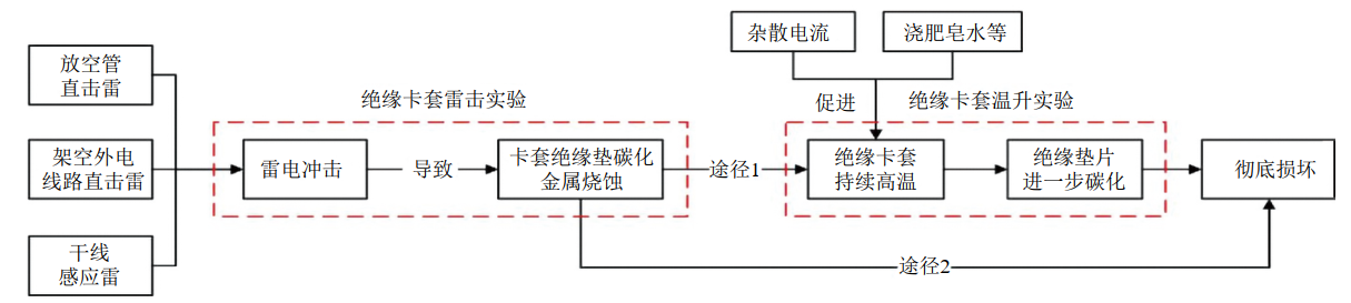 為了模擬絕緣接頭失效過(guò)程,進(jìn)行了DK-LOK絕緣接頭標準雷電波沖擊實(shí)驗。結果表明,17 kA以上級別的標準雷電沖擊可以擊穿DK-LOK絕緣接頭,發(fā)生絕緣墊碳化和金屬燒蝕。其燒蝕機理如圖 2所示,閥室處的直擊雷、管道干線(xiàn)感應雷可能對絕緣接頭造成損傷。絕緣接頭碳化后,低雜散電流干擾強度可以導致絕緣接頭劇烈升溫,進(jìn)一步碳化直至徹底損壞。