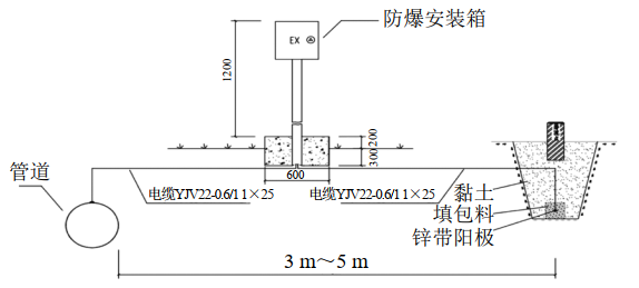 (2)拆除接地系統。測試數據顯示閥室和前后線(xiàn)路交流電壓提升較大,經(jīng)對閥室及進(jìn)出站管道交流電壓和通斷電電位進(jìn)行監測,對比外腐蝕檢測數據和監測數據,確定采用在閥室上下游分別安裝6條鋅帶+固態(tài)去耦合器排流措施(圖 3)。排流后管道交流雜散電流干擾由5.8 V~8.1 V下降為0.24 V~0.37 V。