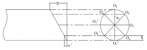 受應力、切割方式等影響,管道切開(kāi)后在垂直或者水平面上表現為斜口,如圖 2所示,可以比較直觀(guān)地看到管口各點(diǎn)的軸向差值與其在測量點(diǎn)所對應的直徑上的投影呈線(xiàn)性關(guān)系。例如測量點(diǎn)O1-O1'的軸向差為x,另有一點(diǎn)On在直徑O1-O1'的投影為k,其所對應的軸向差為kx,也可認為是O1測量值對On的影響。因此,求取O1對On的影響可以轉化為求取On在O1-O1'上的投影。從幾何考慮是一個(gè)簡(jiǎn)單的三角函數,若在劃線(xiàn)時(shí)將管口n等分,則等分角α為360°/n,此時(shí)自下而上各點(diǎn)的系數值為顯然此時(shí)m與圖中的n意義不同,因為管工習慣自上而下進(jìn)行點(diǎn)位標注,代換可得: