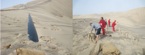 研究表明,沙障高度是決定防護效果的主要因素,沙障被嚴重沙埋會(huì )導致防風(fēng)固沙功能喪失,而輕度沙埋則有助于沙障形成穩定的結構體,在一定程度上提高防護效果[5]。