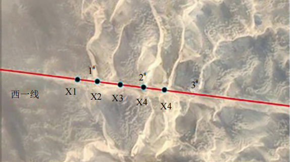 2017年以來(lái),西部管道新疆輸油氣分公司對西一線(xiàn)管道KP788—KP793段穿越庫木塔格沙壟處開(kāi)展管道應變監測。選取五個(gè)典型截面,其中X1、X2截面布設于1#沙丘兩端覆沙較薄段, X3、X5截面位于2#沙丘兩端覆沙較薄段,X4截面位于2#沙丘中部覆沙最厚段,截面間距約60 m(圖 4)。