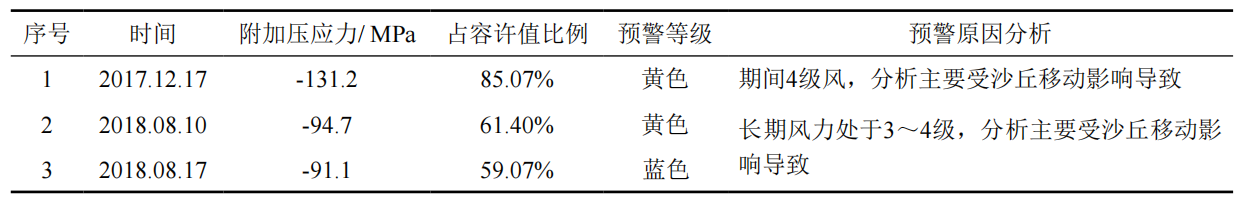 歷史監測周期內,僅有X4監測截面出現過(guò)2次黃色預警、1次藍色預警;其余監測截面均長(cháng)期處于無(wú)預警級別,詳見(jiàn)表 1。