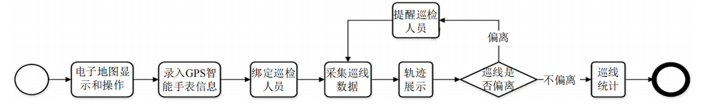 (3)工作流程。首先錄入GPS智能手表信息,然后將其與巡檢人員綁定。巡檢人員佩戴手表巡線(xiàn),手表自動(dòng)記錄巡線(xiàn)數據。系統采集巡線(xiàn)數據并展示巡線(xiàn)軌跡,巡線(xiàn)偏離提醒,統計巡線(xiàn)數據,實(shí)現巡線(xiàn)軌跡查看等功能。工作流程如圖 2所示。