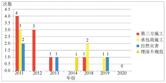 據統計,2011-2020年共發(fā)生20起管道伴行光纜中斷事件,其中因第三方施工造成9起,承包商施工造成6起,占總數的75%。2011年各類(lèi)因素造成斷纜起數最高,2013-2020年逐年下降。2019-2020年連續兩年沒(méi)有出現因第三方施工造成的斷纜事故(圖 1)。