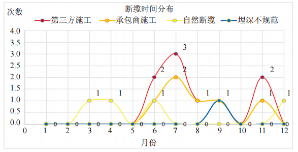 由圖 2可知,斷纜事件主要集中在每年3—12月。其中,第三方施工斷纜、承包商施工斷纜主要發(fā)生在6—11月。根據管道沿線(xiàn)實(shí)際施工情況,每年5—11月是各方施工的高峰期,同時(shí)也是公司管道環(huán)焊縫開(kāi)挖檢測、本體修復開(kāi)挖驗證和評價(jià)等項目施工的高峰期。自然災害斷纜主要發(fā)生在3—6月,這一時(shí)間段是河道泄洪、融雪性洪水的高發(fā)期。