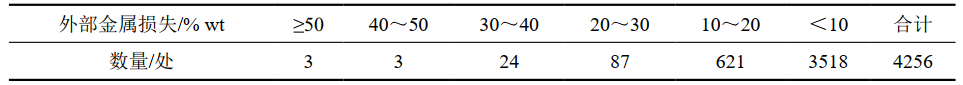為掌握管道真實(shí)的腐蝕狀況,2019年對該管線(xiàn)開(kāi)展漏磁內檢測,共發(fā)現管體金屬損失9303處,大于20% wt金屬損失共計163處,其中內部金屬損失40處,外部金屬損失123處。通過(guò)開(kāi)挖驗證,本次內檢測精度及可信度均滿(mǎn)足要求。