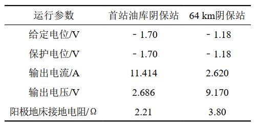 兩座陰保站的恒電位儀運行參數如表 3所示。經(jīng)測試,陰保站恒電位儀輸出正常,陰極電纜、陽(yáng)極電纜、參比電纜、零位接陰電纜完好,參比電極工作正常。首站油庫陰保站恒電位儀輸出電流已高達10.1 A,但距離該陰保站僅12 km的管道陰極保護電位仍然偏正。
