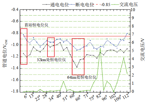 可以看出,32 km處陰保站恒電位儀投用后,首站油庫及64 km陰保站恒電位儀輸出明顯下降,輸出電流分別由10.1 A和3.80 A下降至2.686 A和2.62 A。新陰保站的投用降低了其他陰保站恒電位儀負荷,共同對管道實(shí)施陰極保護。另外,防腐層大修后提升了管道防腐層的完整性,有效減少了陰極保護電流衰減。