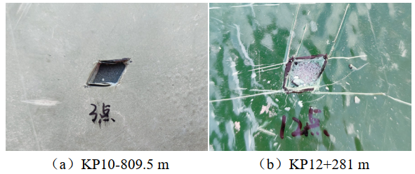兩處聚氨酯防腐補口均存在黏結力降低問(wèn)題,其中,KP10-809.5 m存在鼓泡、流掛和積液現象,已基本喪失對管道本體的保護作用。由于液體聚氨酯補口施工對管道表面狀態(tài)、施工環(huán)境及操作均有較高要求[1],且聚氨酯涂層對陰極剝離較弱的抵抗能力[2],防腐層施工前對管體表面處理不達標、防腐層內部微觀(guān)缺陷的存在及過(guò)負的陰極保護電位引發(fā)的陰極剝離都可能導致鼓泡失效,因此需進(jìn)一步分析確定。