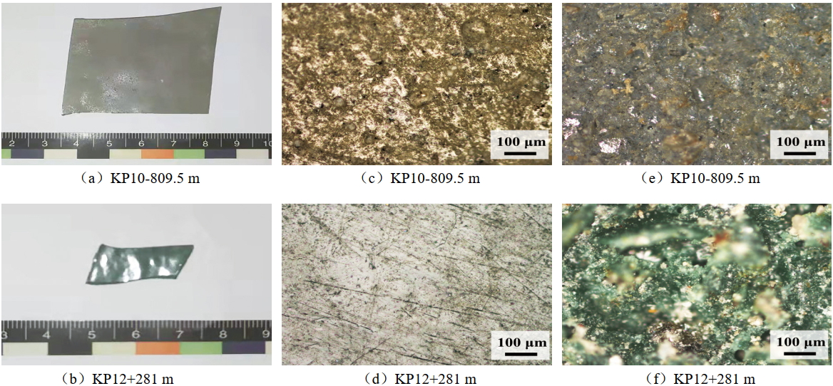 由圖 3可知,兩處管道補口聚氨酯防腐層下方管道表面均未觀(guān)察到呈散點(diǎn)分布的坑穴狀腐蝕,其中,KP10-809.5 m表面較為粗糙,可能發(fā)生了一定程度的均勻腐蝕,而KP12+281 m表面相對光滑,目測其腐蝕程度較輕。