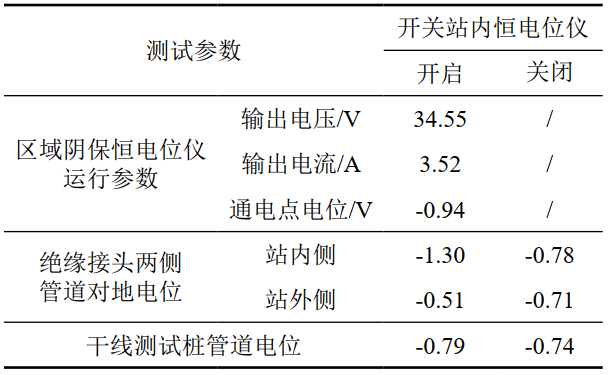 圖 3和表 1以西部某原油管道出站絕緣接頭內外側電位測試數據為例,依次判斷區域陰極保護系統和線(xiàn)路陰極保護系統的相互干擾情況。