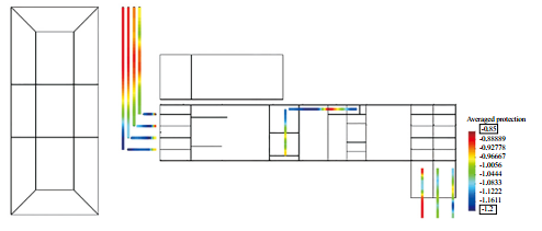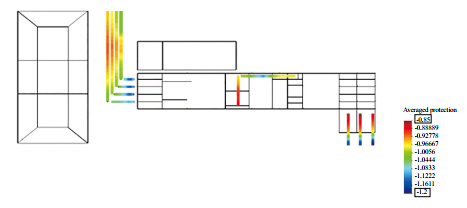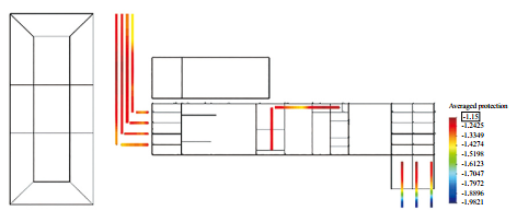 近陽(yáng)極地床最終優(yōu)化方案如圖 4所示,需要陽(yáng)極地床4組,每組3支,長(cháng)1 m,埋深1 m,距離管道1 m,總輸出電流2.4 A,所有管道都在陰極保護準則要求的范圍內,達到良好的保護效果。說(shuō)明通過(guò)近陽(yáng)極地床的優(yōu)化分布,可以實(shí)現站場(chǎng)埋地管網(wǎng)各處達到理想的保護效果。