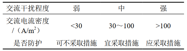 依據GB/T 50698―2011《埋地鋼質(zhì)管道交流干擾防護技術(shù)標準》規定 ,交流干擾判定指標、干擾程度及是否防護如表 1所示。