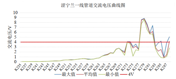 圖 3 澀寧蘭一線(xiàn)管段交流干擾電壓曲線(xiàn)圖