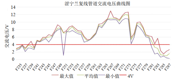 從圖 4 看出:該管段內F243#—F282#區段平均交流電壓超過(guò)4 V;其余均小于4 V,交流干擾程度為“弱”。