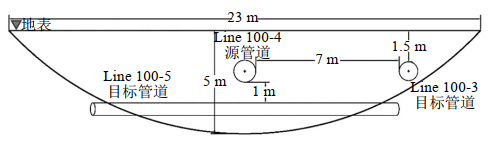 事故現場(chǎng)共有6條管線(xiàn)(Line 100-1~6號)并行,按規定1~4號線(xiàn)的水平間距分別為9.1 m,但3號線(xiàn)和4號線(xiàn)之間的水平間距卻降低為7.0 m,低于公司企業(yè)標準。5號線(xiàn)從1、2、3、4號線(xiàn)下方穿過(guò),頂部與4條管線(xiàn)底部之間的間距0.8 m~1.7 m,符合CSA標準要求。事故源管道和目標管道的空間位置關(guān)系如圖 1所示。