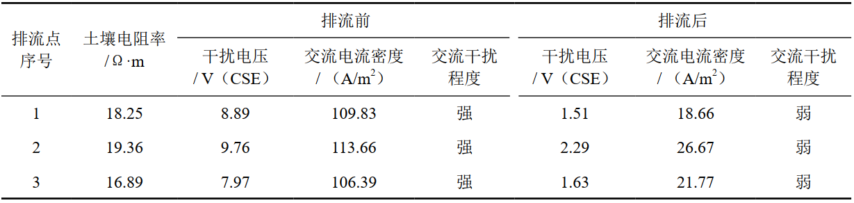 與高壓交流輸電線(xiàn)路并行敷設的管道,與110 kV及以上輸電線(xiàn)最外側邊導線(xiàn)間距小于300 m且累計長(cháng)度超過(guò)2 km的管段,應進(jìn)行交流感應電壓排流防護。平泰管道與220 kV上都高壓輸電線(xiàn)路并行且交叉,與最外側邊導線(xiàn)間距小于300 m范圍內管道長(cháng)度約2.3 km,故共設置3處排流點(diǎn),排流防護采用固態(tài)去耦合器和裸銅線(xiàn),裸銅線(xiàn)沿管道兩側敷設。排流防護結果如表 1所示。