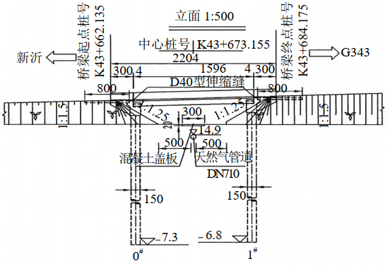 該高速公路大橋接線(xiàn)工程全長(cháng)5.929 km,六車(chē)道標準建設,橋梁寬度33.05 m(與主橋一致),路基寬度34.5 m,設計時(shí)速120 km/h,橋梁跨徑總長(cháng)2145.3 m。