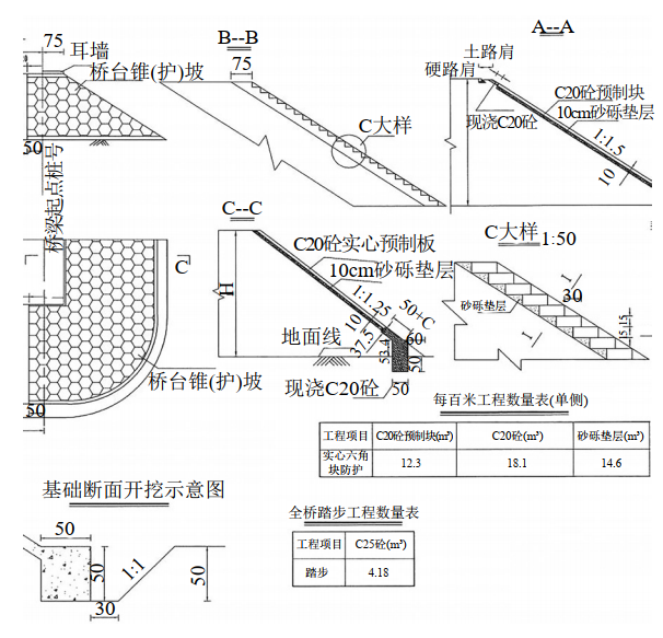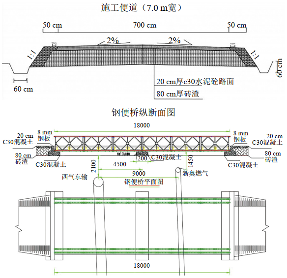 ( 2)施工前需要先完成便道施工。便道采用磚渣和混凝土組成,跨越天然氣管道處采用擴大基礎+下承式鋼便橋方式。如圖 4所示。