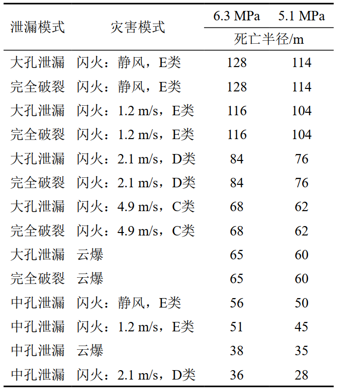 為更直觀(guān)比對,采用中國安科院CASST―QRA軟件模擬計算輸氣管道在各種泄漏模型下的事故后果影響死亡半徑,作為參考。