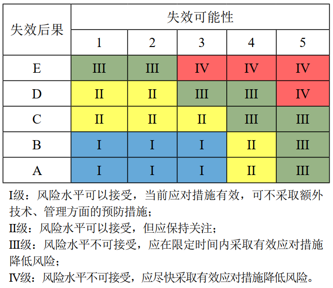 ( 2)降壓運行后,事故發(fā)生概率進(jìn)一步降低,失效可能性仍取1;事故后果影響范圍有所減小,但在其影響范圍內仍將造成大量人員傷亡,失效后果還取E;風(fēng)險等級仍為III級,即較高級,風(fēng)險不可接受。