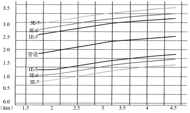 ( 1)降壓運行前,管道企業(yè)采取的一系列措施均從降低事故發(fā)生概率考慮,未采取減小事故后果措施。按表 2所示,假設事故發(fā)生概率低則失效可能性取1;周邊人口密度高管道失效會(huì )造成大量人員傷亡則失效后果取E;風(fēng)險等級為III級,即較高級,風(fēng)險不可接受,應在限定時(shí)間內采取有效措施消減風(fēng)險。