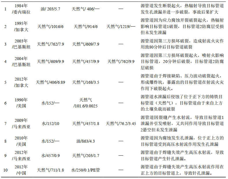 管道并行敷設是將兩條或多條輸油氣管道敷設在間距不大而又平行走向的管溝中。如同單條管道一樣,并行敷設的管道在服役過(guò)程中,受到腐蝕、第三方損壞、地質(zhì)災害等因素影響,可能發(fā)生失效導致管內介質(zhì)泄漏,進(jìn)而造成嚴重的事故后果。由于天然氣高壓、易燃和火焰高溫特性,輸氣管道是發(fā)生事故后果多米諾效應的主要考慮對象。當一條管道(以下簡(jiǎn)稱(chēng)源管道)發(fā)生爆炸、燃燒時(shí),會(huì )對并行管道(以下簡(jiǎn)稱(chēng)目標管道)產(chǎn)生超壓沖擊波或熱輻射,研究表明由于天然氣的可壓縮性,爆炸沖擊波在土壤中所產(chǎn)生的壓力比在空氣中所產(chǎn)生的壓力更大,對埋地管道的破壞程度也更嚴重。目標管道受到源管道泄漏后形成的火災熱輻射影響,可能會(huì )在持續高溫下發(fā)生管材屈服破裂,而與水管線(xiàn)并行則可能是在高壓水射流的影響下導致管體受損,如表 1所示。