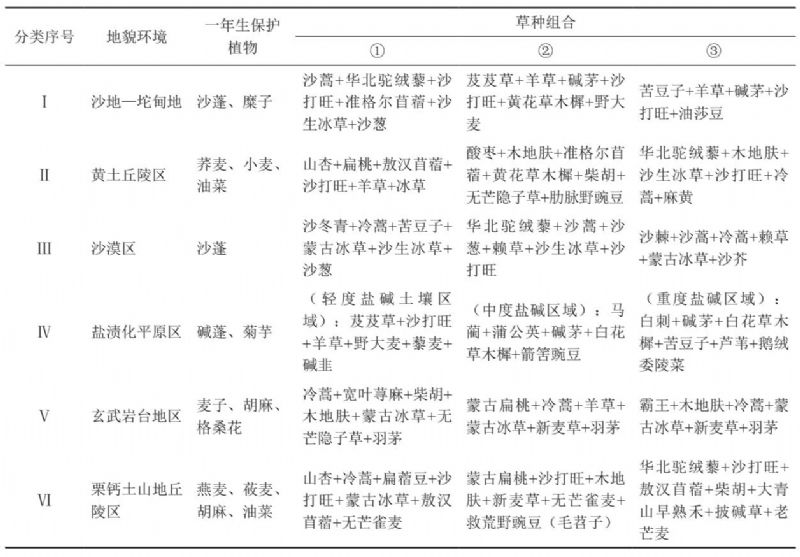 (1)草種組合。根據不同地貌環(huán)境,選擇適宜的草種組合,見(jiàn)表 1。植被分布區域見(jiàn)圖 1。