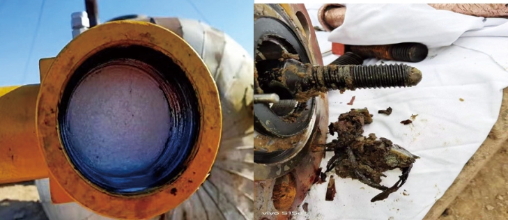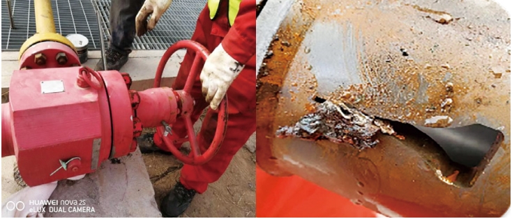 2022年12月,中石化某儲氣庫采氣管道井口節流閥節流出現凍堵,帶來(lái)了生產(chǎn)與安全隱患,不得不停產(chǎn)進(jìn)行處理(圖 1)。該氣田地層深度為2630 m~3305 m,井口具有超高壓、大壓降的特點(diǎn),采氣過(guò)程中天然氣帶出較多水分、鉆井液、固體物(包括砂、凝結物)等雜質(zhì),因地面系統流通口徑變化,介質(zhì)溫度進(jìn)一步下降導致管道內水分結冰,天然氣水合物生成而造成冰堵,使采氣流通流量變小,原設計的角式節流截止閥籠套開(kāi)孔在小開(kāi)度范圍內極易發(fā)生堵塞、操作機構卡頓等現象。
