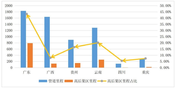 圖 1 華南公司2023年各省市高后果區里程及占比