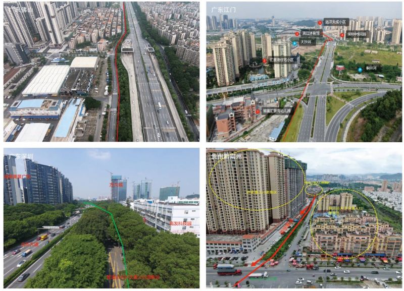 華南公司目前管轄廣東、廣西、貴州、云南、四川、重慶等6省市6000余公里成品油管道,2023年識別高后果區1163處、高后果區里程約1358公里,占比約22%,其中廣東地區高后果區總數540處、里程792公里,占比約43%,均明顯高于西南其他省市(圖 1);此外,廣東深圳、廣州、東莞、佛山、中山、珠海、江門(mén)、貴州黔南州、貴陽(yáng)等地區部分管道穿越城區,管道周邊密集分布大型住宅社區、寫(xiě)字樓等人員密集場(chǎng)所(圖 2),高后果區風(fēng)險管控難度大。