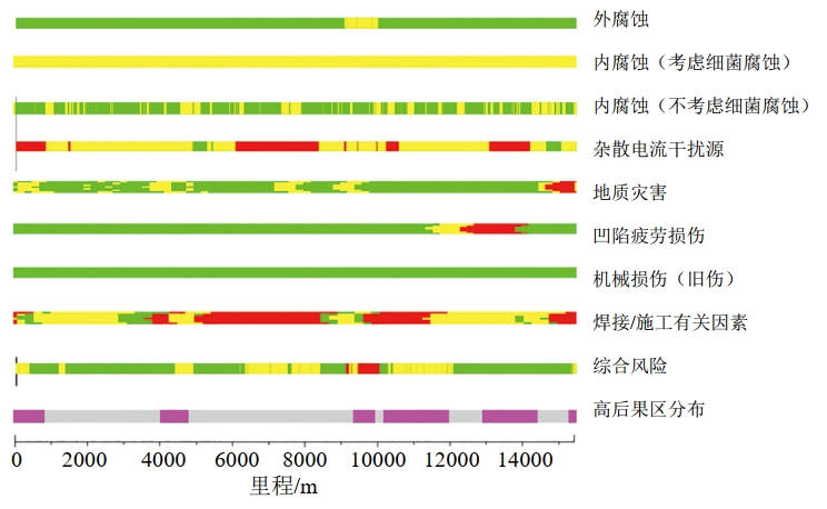 通過(guò)開(kāi)展“管道大摸底、隱患大排查、管理大提升”活動(dòng),全面完成內外檢測、地災排查、高后果區再識別等“體檢”,匯編成公司管道管理數據手冊、水系圖和事故案例集。完成了高后果區重點(diǎn)風(fēng)險因素梳理,開(kāi)展了以樁號/里程為基準的管道內外部重點(diǎn)風(fēng)險對齊和管道綜合風(fēng)險分析與評價(jià)。根據數據對齊和風(fēng)險評價(jià)結果,制作11項重點(diǎn)業(yè)務(wù)管理看板,采取“掛圖作戰”一表式推進(jìn)問(wèn)題整改。以坪山—媽灣為例,通過(guò)內外檢測雜散電流干擾、地質(zhì)災害、管道焊接/施工有關(guān)因素(管道底片)、管道第三方施工(機械損傷)等數據對齊(圖 3),識別出該段管道高后果區較突出的風(fēng)險為與焊接施工有關(guān)因素和雜散電流干擾因素。完成了高后果區范圍高失效可能性的23處環(huán)焊縫缺陷修復,對雜散電流干擾進(jìn)行了治理。針對處于高后果區的中等失效風(fēng)險,制定三年分級治理策略,逐年推行風(fēng)險降級。同時(shí),根據對齊結果,加強高后果區重點(diǎn)風(fēng)險的感知與預警,彌補人工巡檢時(shí)效性和可靠性不足的問(wèn)題。在高后果區中等失效可能的某閥室安裝部署無(wú)人機機庫,日?蛇M(jìn)行以閥室為中心點(diǎn)的4條線(xiàn)路巡檢,全面覆蓋9.7 km的重點(diǎn)高后果區,常態(tài)化全天候開(kāi)展16架次/天的巡檢工作,對第三方施工作業(yè)、地質(zhì)災害等異常目標實(shí)時(shí)識別和預警。