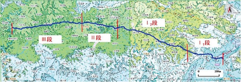 前期對川東北管道InSAR成果分析,管線(xiàn)兩側各一公里區域有58處出現變形,其中14處變形較大。結合收集到的沿線(xiàn)地質(zhì)災害點(diǎn)及發(fā)育規律,經(jīng)野外實(shí)地考察和驗證,發(fā)現地質(zhì)災害隱患點(diǎn)12處。同時(shí)將全線(xiàn)的地質(zhì)災害隱患按地層、巖性及主要誘因,劃分為滑坡型為主、工程建設導致次生災害型、滑坡崩塌共存三種類(lèi)型和四個(gè)區段(圖 1)。