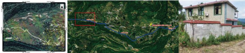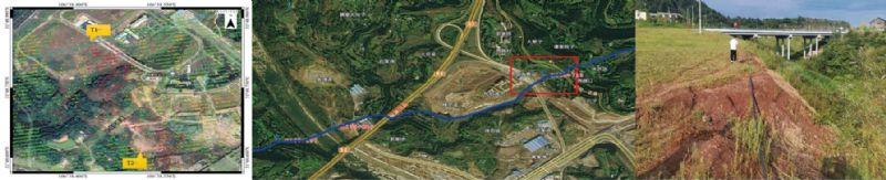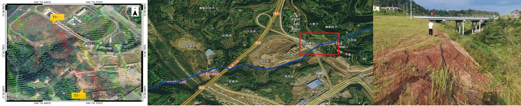 圖 2 K135+713區段InSAR結果、光學(xué)影像及現場(chǎng)調查圖