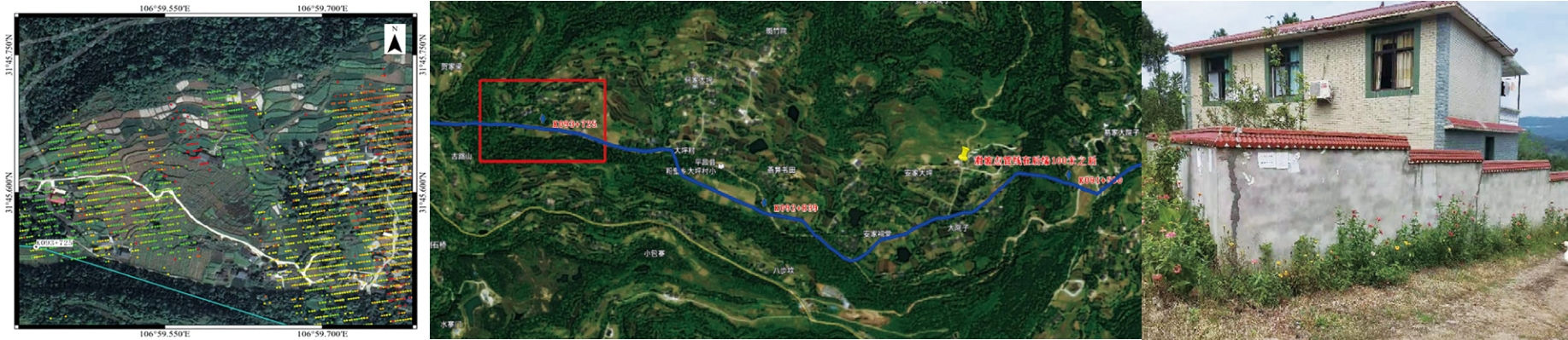 圖 3 K093+725區段InSAR結果、光學(xué)影像及現場(chǎng)調查圖