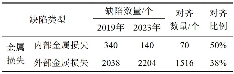 與附件特征對齊比例相比,本體缺陷對齊比例要偏低,主要原因為不同內檢測承包商對缺陷的量化識別差異。針對未匹配的金屬損失分析,某缺陷2019年檢測被識別為焊縫異常,2023年識別為金屬損失,導致列表無(wú)法匹配(圖 3)。